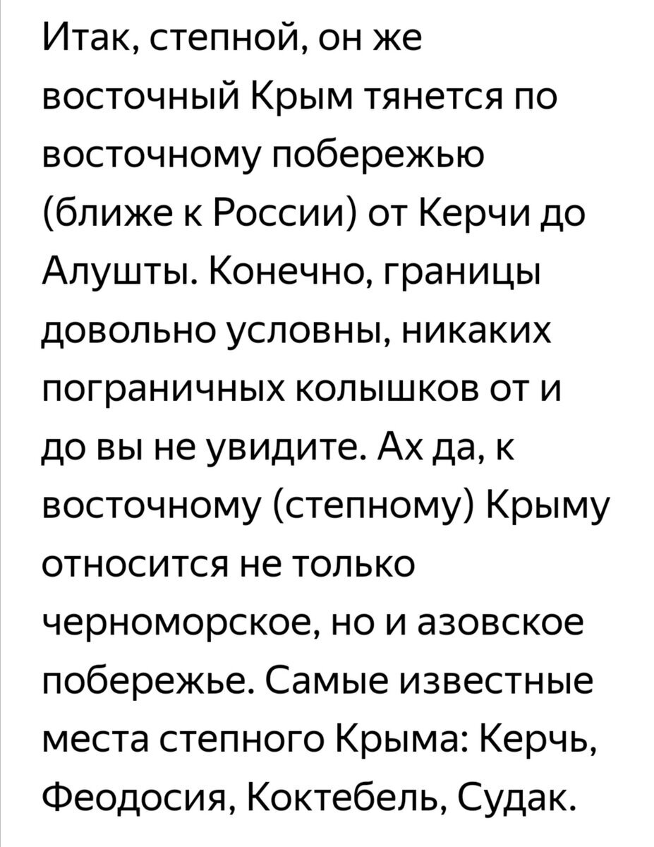 Я прям не знаю, плакать мне или смеяться, хотя хочется третьего - отп....ть того, кто писал этот бред. Мне интересно, сколько классов закончил автор? Вот скажите, зачем человеку голова с мозгом, если он и не умеет и не хочет думать???? Ну, хоть бы Вики открыл, почитал, что ли... Вспомнила сейчас, как на забаненном канале ко мне пришла дама (или не дама? 😁) и стала фыркать в сторону Крыма, мол, раскрутили это "село" зачем-то, а там одни степи. То ли дело - Италия. А потом пишет, что отдыхали в Судаке они, не понравилось, так как нет гор. Правда фото с отдыха так и не предоставила)))).....