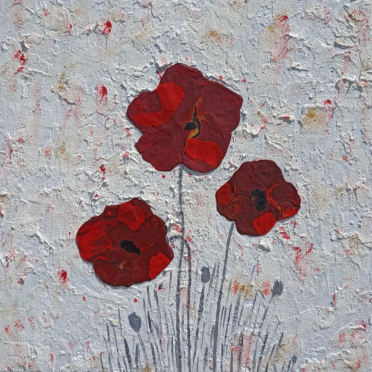Картина "Маковое трио". Холст на подрамнике, декоративная штукатурка, акрил, патина. Фактурная живопись. Когда снега вьюга уже нипочем И хочется радостно прыгать, Цветы распустились под зимним ковром, Им Солнце сиянье вручило. © Художник Вилена Салтыкова