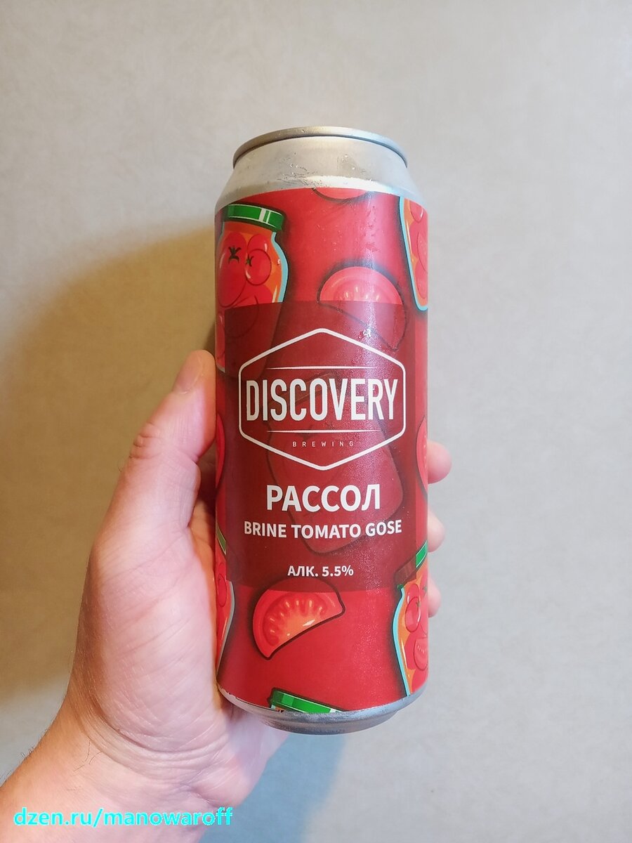 Да, сегодняшнее пиво так банально и называется - "Томатный рассол". А варит его питерская пивоварня Discovery Brewing. С данной пивоварней я до сих пор не сталкивался, так что посмотрим, что они о себе расскажут: Мы - Discovery Brewing, команда энтузиастов, которую объединила любовь к пиву и пивной культуре. Долгие годы, пока крафтовая революция шагала по российскому рынку, мы пробовали и выделяли лучшее. Работали над рецептурой и ценообразованием, чтобы сделать качественный, но в то же время доступный каждому продукт. Мы хотим поделиться с миром тем, что стало для нас классикой. Discovery Brewing - мы делаем качественный крафт доступным! Ну а теперь перейдем к пиву. Впервые эту гозешку сделали в июне 2020 года. И, судя по всему, она удалась, раз ее выпускают до сих пор. Впрочем, проверим. Моя банка из февральской партии, вскрыл же я ее спустя три с половиной месяца. Срок годности составляет 240 суток. В составе, кроме классических пивных ингредиентов, присутствует томатный рассол, не