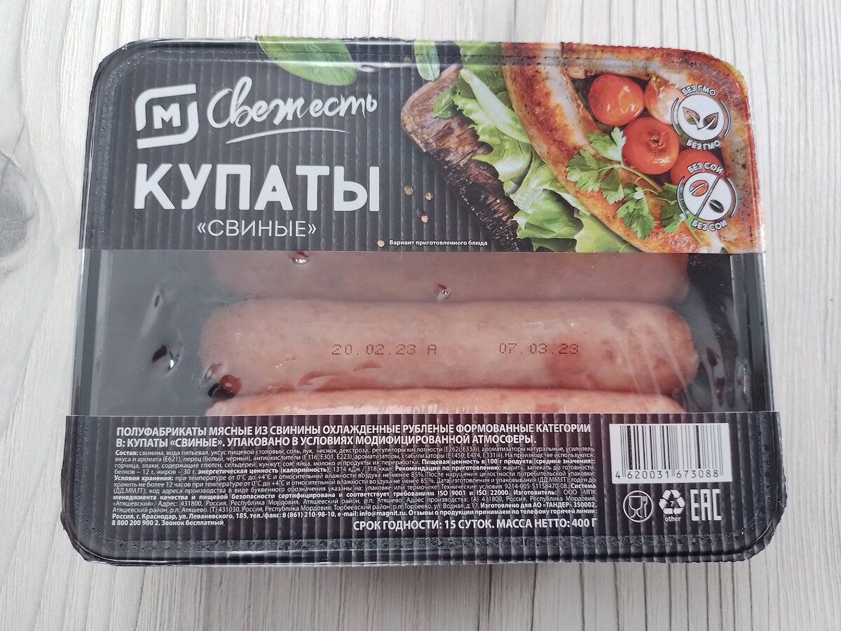 Еще в феврале мы жарили на мангале купаты от "Магнита", а отзыв я до сих пор нигде не написала. Не пропадать же фото, тем более мангальный сезон в самом разгаре. Производит купаты МПК "Атяшевский". И опять я узнала об этом, когда внимательно изучила этикетку по фото) У меня все-таки к нему предвзятое отношение. И, как оказалось, не зря. В составе купат, помимо свинины и воды много разных добавок: декстроза, уксус, 2 регулятора кислотности, 3 антиокислителя, 3 стабилизатора. Ну и куда уж без усилителя вкуса и ароматизаторов. Какая часть свинины использована, разумеется, не указано. Изготовлено для АО "Тандер". Я работала с менеджерами "Тандера" по закупкам и прекрасно знаю, что им неважно качество, состав и вкус продукта, им важна цена. Они просто требуют минимально низкую отпускную стоимость, чтобы получить максимальную выгоду. Я не буду вдаваться в подробности всех этих процессов, но именно поэтому многие продукты в "Магнитах" несъедобны, а не потому, что производитель такой паразит,