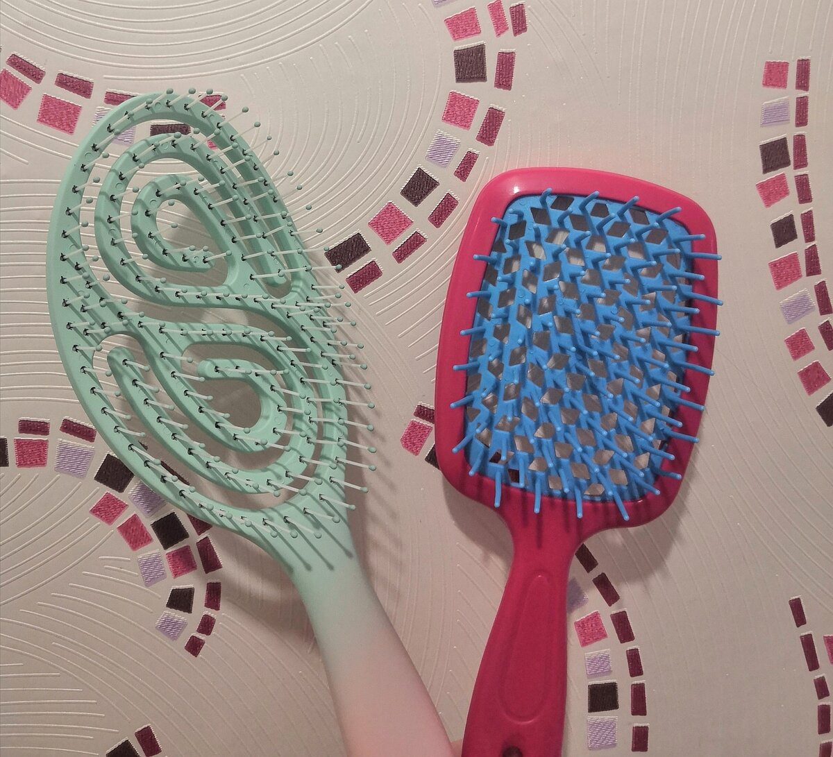 Хочу поделиться своими новыми расческами. Одну (розовую с синим) заказывала на Али Экспресс, а вторую (бирюзово-розоватую) купила в Магнит Косметик. Каждая около 200р стоили. Розовая очень хорошо расчесывает даже спутанные волосы или мокрые. А бирюзовая и расчёсывает, и супер массирует голову😌