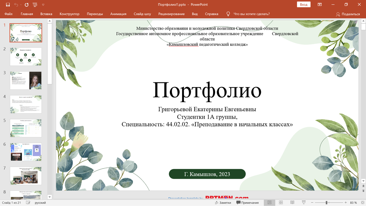 Портфолио- это папка с результатами и достижениями учащегося за год, которая поможет понять уровень профессионального развития и социальных навыков. Цель портфолио-Уведомить об успехах и достижениях в процессе получения знаний. Сформировать у студентов потребности в профессионально- личностном саморазвитии, умение анализировать достижения и личные результаты, дать оценку успешности освоения программы и внеурочной деятельности. Как защитить портфолио Задача студента -не только сделать своё портфолио красочным и интересным и максимально полным, но и достойно его защитить. Во время защиты комиссия будет оценивать следующие факторы: Несколько слайдов из моей презентации:
