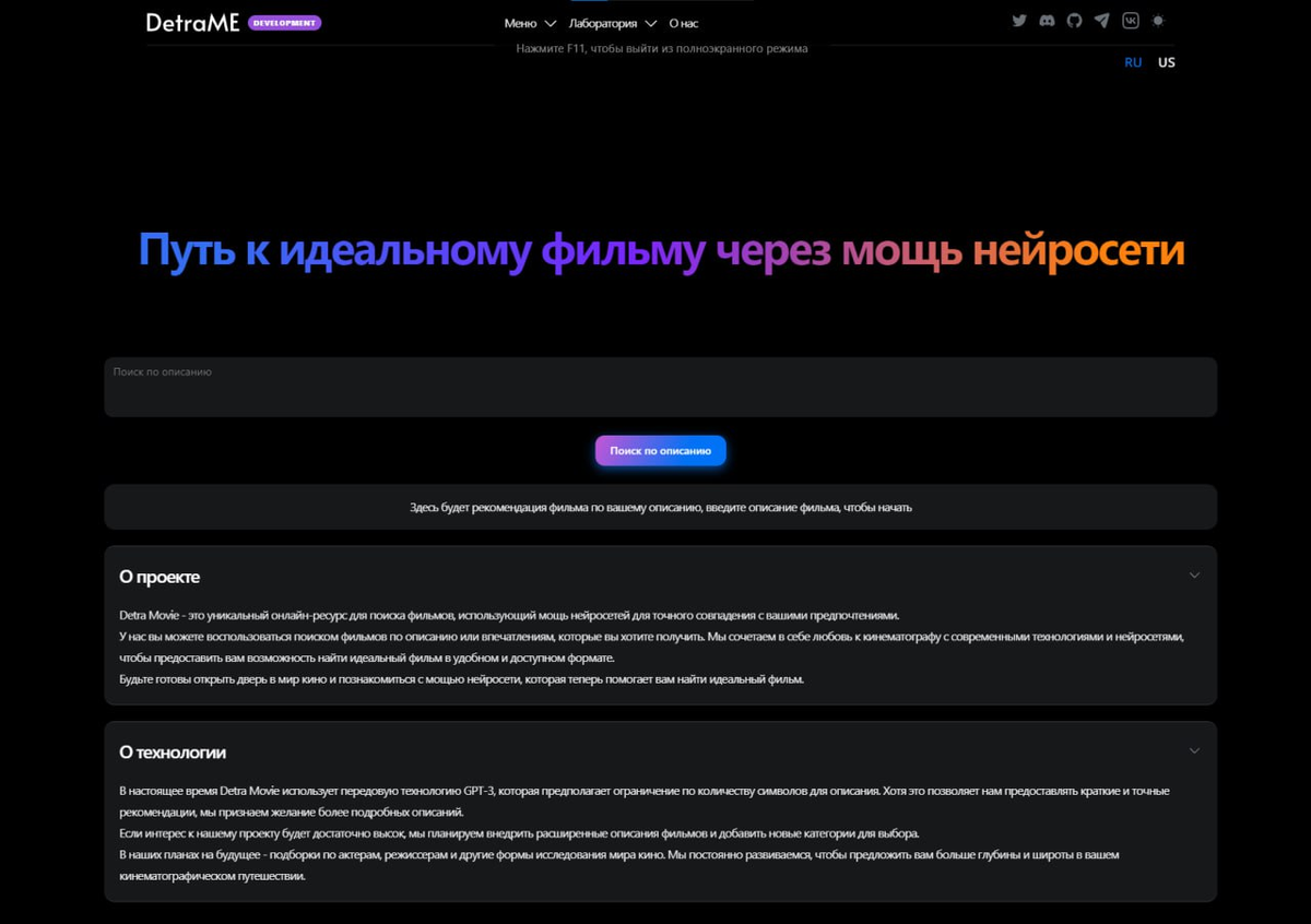 С помощью сервиса можно быстро и легко выбрать фильм с помощью нейронной сети. Просто введите краткое описание того, что вы ищете, например: "Фантастический боевик про путешествия во времени", и ИИ предложит подходящие варианты. Больше не нужно тратить время на изучение длинных списков фильмов, просто сохраните свой запрос и найдите то, что вам нужно быстро и удобно.
