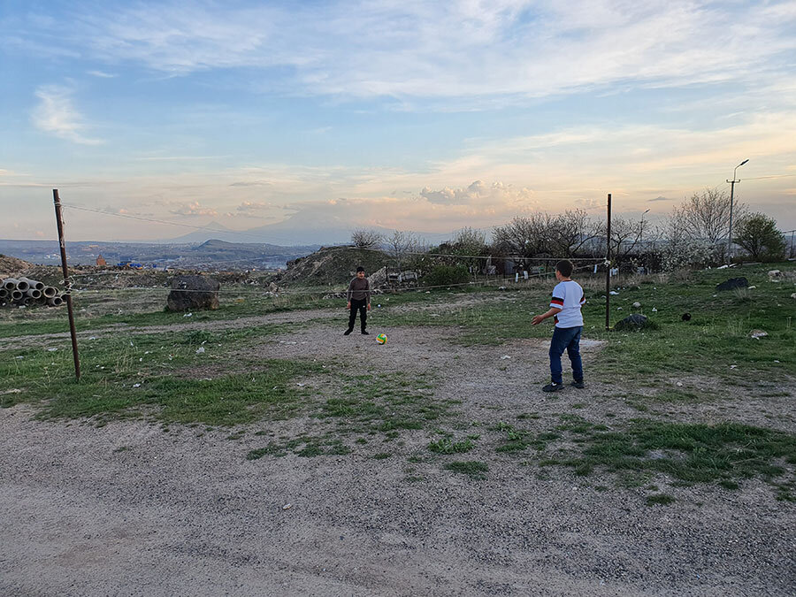 В настоящий момент это выглядит так. Есть два столба для волейбола, на которых дети вместо сетки натянули веревку: Правда, площадка эта немного каменистая и не очень располагает к игре, т.к. когда в 2020 в поселке впервые за 25 лет (!) укладывали асфальт, никто не догадался попросить/настоять, чтобы кроме дороги заасфальтировали еще небольшую спортивную площадку.