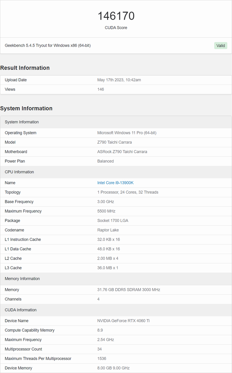 Издание Wccftech смогло отыскать данные о первых тестах видеокарты NVIDIA GeForce RTX 4060 Ti. Информация поступила из базы бенчмарка Geekbench 5. Согласно первым тестам, GeForce RTX 4060 Ti набрала 146 тысяч баллов, в то время как RTX 3070 — 150 тысяч, а RTX 3060 Ti — 128 тысяч. Журналисты подчеркнули, что в играх производительность может быть иной. Характеристики GeForce RTX 4060 Ti: Если верить СМИ, то цена GeForce RTX 4060 Ti (8 ГБ) составит $ 399 или около 32 000 рублей. Видеокарта поступит в продажу 24 мая этого года. Заглавное фото: PC Gamer