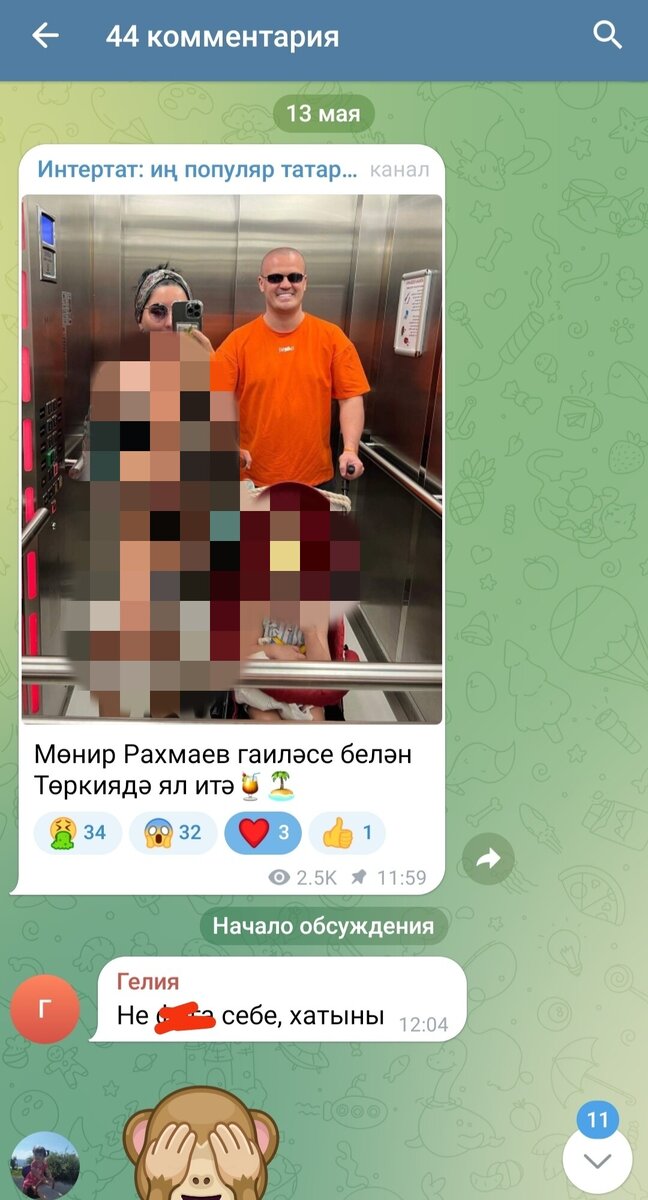 Фотосурәттә: бәхеттән балкыган Мөнир Рахмаев, ялангач диярлек кыяфәттә фото төшерүче хатыны Илсөяр һәм аларның кызлары. Гаилә, баланы коляскага утыртып, лифтта төшеп яки менеп бара. Ярымялангач хатын бина эчендә дә шулай йөргән инде, күрәсең. Бу фото астына Мөнир үзе: «Рәхәтләнеп ял итәбез, Аллага шөкер», – дип язып куйган.