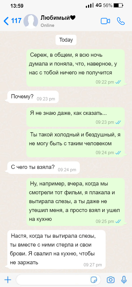 Смешные переписки в мессенджерах - это неотъемлемая часть нашей повседневной жизни. Ведь, будь то общение с друзьями или работой, мы всегда можем натолкнуться на что-то забавное и неожиданное. Одним из самых популярных мессенджеров является WhatsApp. Именно здесь пользователи создают смешные диалоги и делятся ими со своими друзьями в социальных сетях. Любовь - это как WiFi. Ты не можешь видеть ее, но она всегда есть, и когда ты потерял ее, то начинаешь понимать, что без нее жизнь становится бесполезной! Когда я спросил маму, почему я не могу пойти на родительское собрание, она сказала: 'Ты же знаешь, что ты сирота'. Я только потом понял, что это была ее способ сказать, что она сама не хочет идти Котов много не бывает. Они как солнечные лучики - чем их больше, тем теплее и светлее в душе! Таксисты тоже могут быть одинокими. Они привозят людей к их счастью, но сами не всегда находят свое собственное. Путь к сердцу мужчины лежит через желудок, но не стоит увлекаться этим прямым путем, ина
