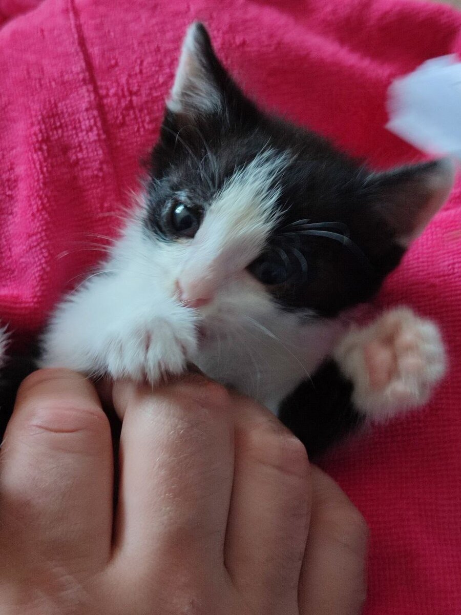 Москва! Очень срочно. Котэ. 1 штука. Мальчишка. Черно-беленький. Примерно месяц. Смотрите, какие у него ручки! Кушает сам. Все что надо умеет. И даже больше:) С рук не слезает, спит на коленях, ласковый очень. Вчера знакомые нашли вот такой комочек с залепленными глазками. Откуда во дворе появился - не понятно. Отстал от мамы? Потерялся? Скорее, выкинули... Но не хочется об этом здесь в очередной раз рассуждать. Тыкался в ступеньку перед подъездом и жалобно пищал. Вообще-то эти люди кошек не держат. Не могут, хотя и любят. У молодого человека очень сильная аллергия, астматический компонент. Но сердце не каменное, к счастью... Потащили в ветеринарку, оказалось, что все хорошо, только глазки попромывать. Дома обработали глаза, дали суспензию от глистов. Накормили. Он отоспался и начал искать общения. Обалденно ласковый и игривый ребенок оказался. На ручки просится все время, активный. Сегодня отмыли. Мылся терпеливо и стоически, не возражал. Глаза уже почти пришли в норму, но ещё неско