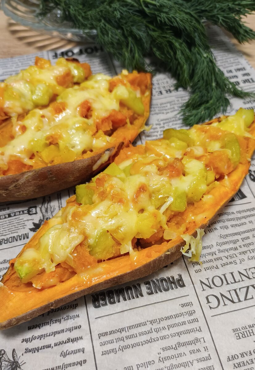 Из остывшего батата вытащить сердцевину, оставив кожуру и немного мякоти, нарезать её кубиками и добавить к овощам в сковороду, перемешать и готовить всё вместе ещё около 3-4 минут. Начинку выложить в лодочки из батата. Посыпать натёртым сыром.