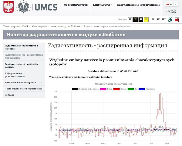 Взрыв склада с боеприпасами под Хмельницким вызвал панику на Западной Украине. Ветер занёс радиоактивную пыль в Польшу и в Молдавию. Уровень загрязнения изучается, на Украине нет внятных официальных объяснений и предупреждений для населения. В Польше, кстати, тоже. Но энтузиасты находят информацию и комментируют её. Читаем новость. В польском Люблине зафиксирован скачок уровня радиации В польском Люблине зафиксирован резкий скачок уровня висмута, титана и радиационного фона в атмосфере. Висмут используется при креплении деталей, содержащих уран и вольфрам, что многие в Польше связали с недавней бомбардировкой складов ВСУ в Хмельницком и Тернополе, где предположительно хранились полученные из Великобритании снаряды с обедненным ураном. Дальше, согласно карте ветров сложилась удручающая ситуация, и вот уже уровень висмута подскочил почти в 7 раз от нормы (остальное, включая радиационный фон хоть и выросло, но осталось в пределах допустимой нормы, хотя уровень радиации добрался до порогов