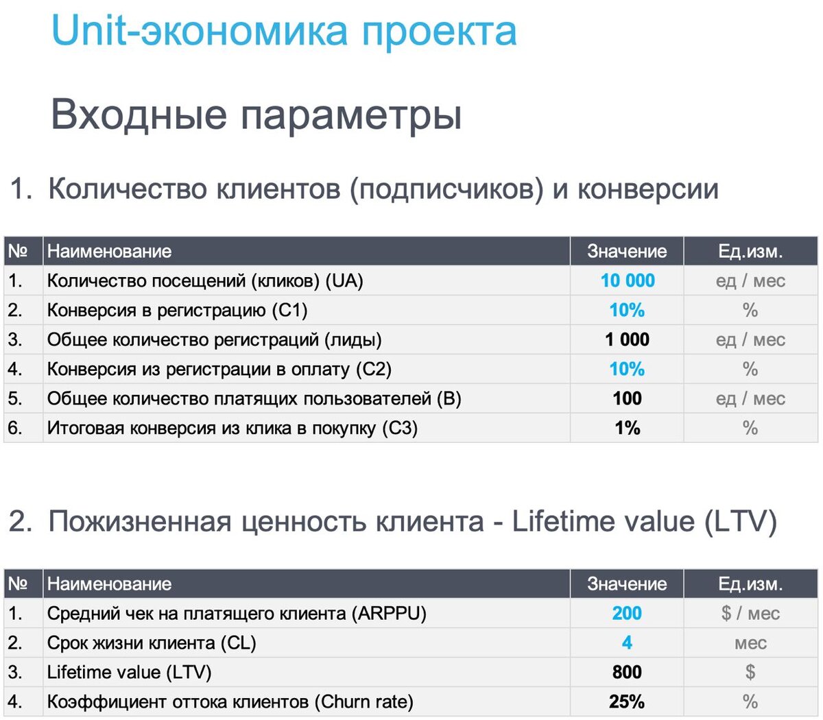 - Результаты LTV (чистая выручка на 1 клиента) и CAC (себестоимость привлечения 1 клиента)