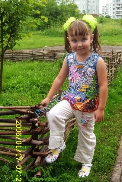 Здравствуйте, дорогие подписчики! Расскажу вам историю моего знакомства с ирландским кружевом. Лет 13 назад мне попался журнал по вязанию и в нем удивительной красоты Топ в технике ирландского кружева. Меня просто очаровала эта красочная и необыкновенно реалистичная кофточка с обитателями морского дна – медузами, осьминогами, ракушками,крабами, рыбками и водорослями. В журнале Топ был выполнен для взрослой модели, я же решила связать детскую кофточку, так как это было мое первое знакомство с этим видом творчества. Порядок работы таков: Поэтапно следуя инструкциям у меня получилась уникальная вещь! Смотрите сами! И огромная благодарность авторам этой прекрасной модели! P.S. Кофточка до сих пор прекрасно выглядит и покоряет окружающих своей уникальностью.