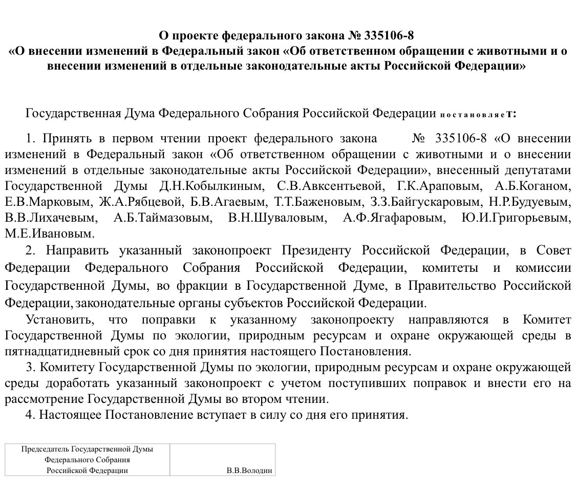 Депутаты Госдумы в первом чтении приняли законопроект, который наделяет региональные власти правом самостоятельно определять порядок обращения с бездомными животными. Действующее законодательство запрещает умерщвлять бездомных животных. Поправки были разработаны после того, как в апреле восьмилетний мальчик умер после нападения стаи бездомных собак в Оренбурге. Один из авторов поправок председатель комитета Госдумы по экологии, природным ресурсам и охране окружающей среды Дмитрий Кобылкин говорил, что законопроект «не закрывает приюты», а помогает регионам, которым сложно выполнить требования закона в части организации приютов из-за «их удаленности и малочисленности населения»…. Первоисточник: Коммерсантъ Ссылка на законопроект: https://sozd.duma.gov.ru/bill/335106-8