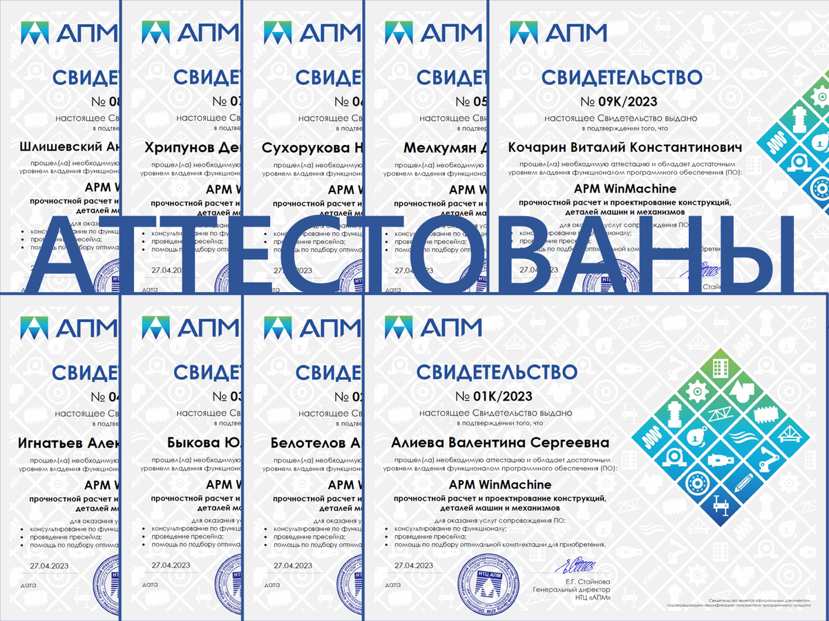 Процесс сертификации инженеров по использованию программного обеспечения включает несколько этапов. В ноябре прошлого года 9 сотрудников нашей компании и инжинирингового центра прошли обучение по работе в программном продукте APM WinMachine. Следующим этапом специалисты получили от разработчика индивидуальные задания на расчет конструкций и деталей на прочность, которые с успехом выполнили. Далее разработчик “экзаменовал” инженеров по выполненным индустриальным задачам, после чего принималось решение о сертификации.