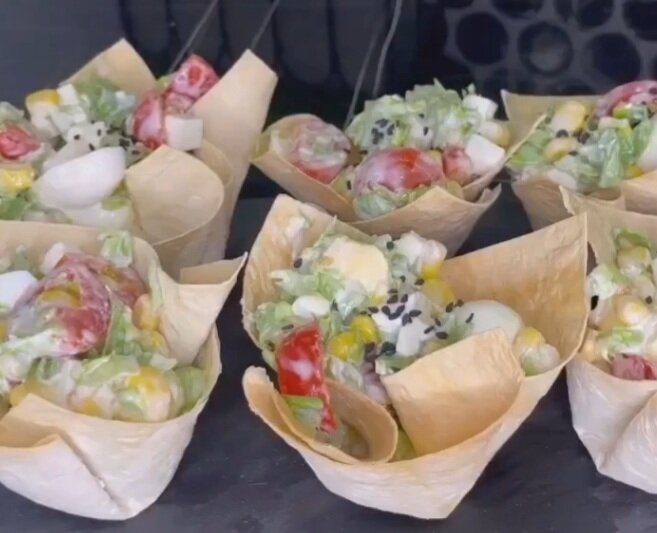 Понадобится: Лаваш Черри Лист салата Сметана или майонез Кукуруза консервированная Брынза Перепелиные яйца Соль Чеснок Черный кунжут для украшения Готовим: Лаваш нарезаем на квадратики и укладываем в формочки для кексов. Подсушиваем в духовке при 190гр 10-мин. Нарезаем лист салата мелко, черри пополам, брынзу на кубики, яйца перепелиные пополам. Теперь всё смешиваем, добавляем кукурузу и заправляем майонезом (сметаной) с чесноком. Раскладываем по формочкам из лаваша, украшаем черным кунжутом. Готово! Приятного аппетита!