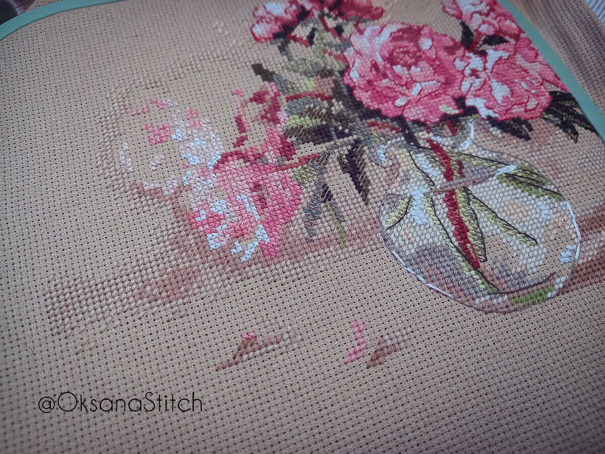 Самый мой любимый этап в вышивке - приближение к финишу! Однозначно скажу, что завершать работы я люблю больше, чем начинать (несмотря на 20 начатых работ!) Вот и сейчас я со скоростью, если не паровоза, то, как минимум, трамвая, двигаюсь к завершению сюжета Dimensions Peonies in Vase. Напомню, что работу эту я вышиваю по копии Amishop. И, на мой взгляд, копия высочайшего качества, соблюдены все бленды, сложения нитей, бэк, цвет основы и оттенки ниток! "Пионы в вазе" у Дим - это серия Мини Голд (Gold Petites), работа, в целом, не сложная, но повозиться кое-где придётся. Ещё 1000 крестиков и этот маленький очаровательный букетик в стеклянной вазе перейдет в мою коллекцию вышитых работ.