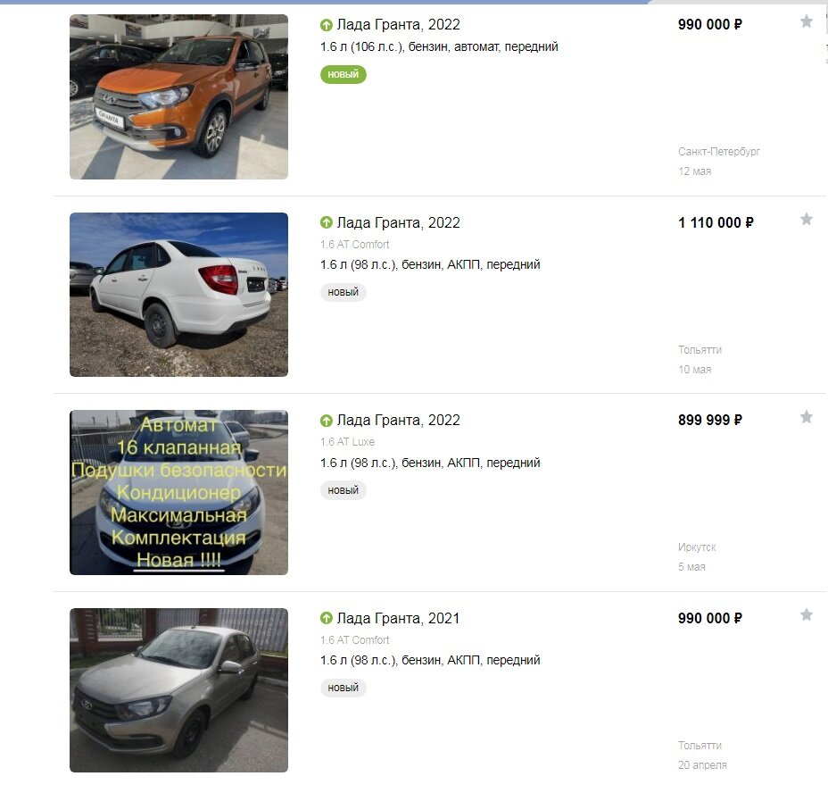 Цены на автомобили в последние годы не радуют. Если ещё каких то 2-3 года назад, за 1 - 1,3 млн.руб., мы могли купить Рио, Поло, Солярис, Рапид или к примеру Дастер, в хороших комплектациях, то теперь выбор в этом ценовом диапазоне небольшой. А в случае если нужен автомобиль ещё и на автомате, то выбора можно сказать вообще нет. Если ещё недавно по запросу самый дешевый автомобиль на автомате выходила Лада Гранта, то теперь Ладу Гранту на автомате не производят. Гранта на автомате появится не ранее 2024 года, да и то это уже будет не классический японский автомат, а китайский вариатор. На всю Россию продаётся всего четыре новых Лады Гранты, цена от 900 тыс.руб., до 1,1 млн.руб. Два автомобиля на 4-ступенчатом автомате, два на роботе. Одной из объявлений Гранты за 899 тыс.руб. вообще похоже на обман, так как написано максимальная комплектация на автомате, а по факту минималка на роботе. Попытался связаться с продавцом, но он трубку не берёт. Для интереса также позвонил по седану с АК