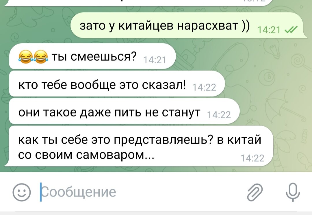 Ты смеёшься? Они такое даже пить не станут! Так говорит Люда про судьбу Иван-чая у китайцев. Она живет в Чигирях (это недалеко от Китая, под Благовещенском) и не верит в то, что Иван-чай может стать там популярным. Мол, уж что-что, а про жителей Поднебесной и их традиции ей рассказывать не надо — она и так все отлично знает! А мне всегда казалось, Иван-чай очень востребован у них. И полезный, и натуральный... почему бы нет? Да и кто-то мне уже рассказывал, что разлетается он в Поднебесной, как горячие пирожки... А Люда парирует: Как ты себе это представляешь? В Китай со своим самоваром... Почему бы нет? Как оказалось, не так всё просто. Люда объяснила, почему все разговоры о том, что Иван-чай чуть ли не мечта китайцев — не более, чем выдумки русских... Во-первых, речь идёт о Китае. О стране, где своего чая валом. Причём, культура его потребления тоже своя. У китайцев есть зелёный, чёрный, жёлтый, белый... какой хочешь чай! Зачем им ещё и русская «подделка»? У меня тут же возн