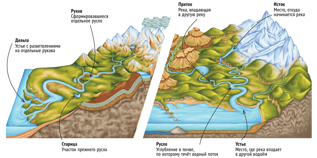 Притоки - малые реки, которые впадают в одну основную реку (они бывают правыми и левыми);