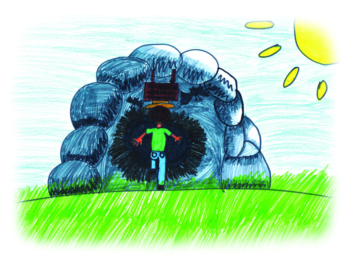 «Когда-то на этой местности жило одно очень умное племя, которое считало себя самым современным племенем во всём мире. И называлось оно Изобретики. Каждый житель всё время что-то изобретал для своей семьи. Но при этом у них не было ни домов, ни лошадей потому, что им некогда было думать об этом. А жили они в своих изобретениях. Например, изобрели шар, закрепили его, разделили на комнаты, и жили в нем.