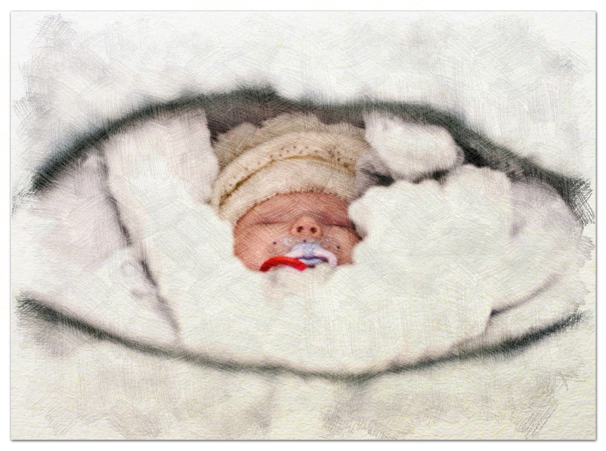 На снегу лежит младенец. Он укутан в тёплое одеяло, но девушка удивилась: «Каким же надо быть жестоким человеком, чтобы бросить ребёнка на улице в мороз». Она схватила несчастное создание и, прижав его к себе, побежала в дом.