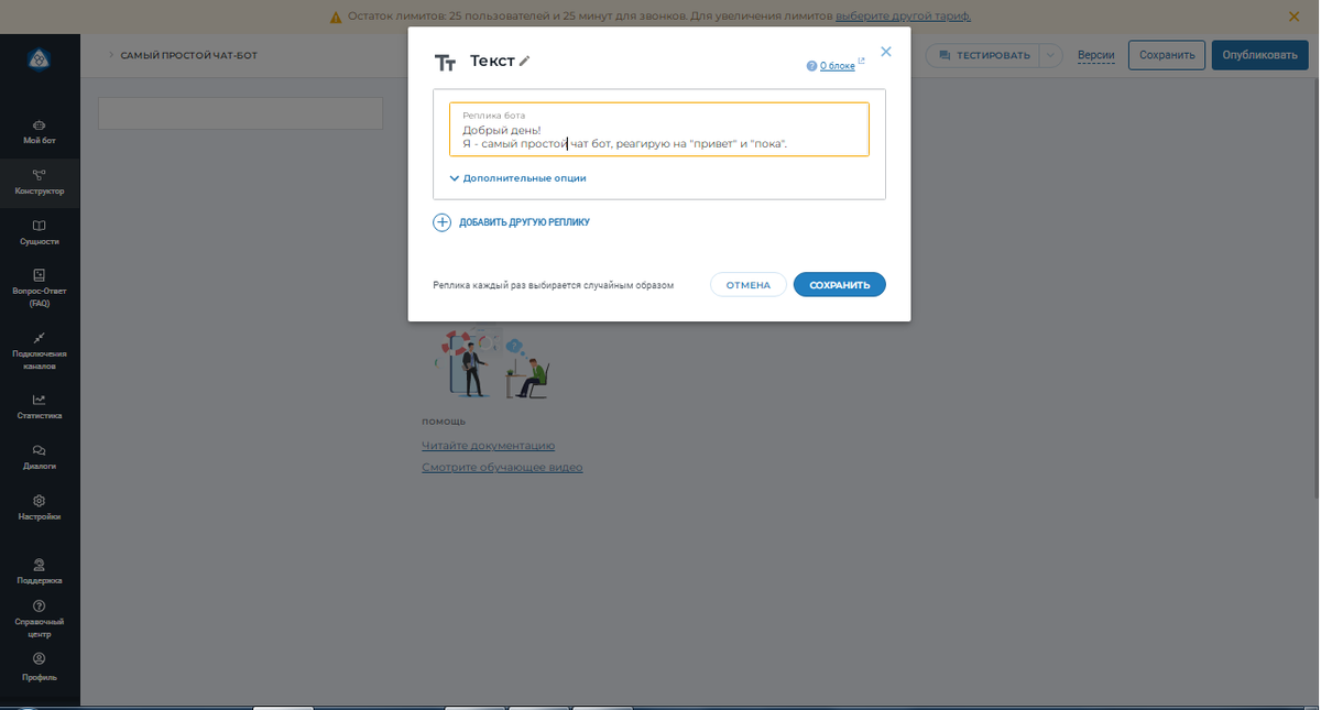 При нажатии на "Тестировать" появляется окно чат-бота с приветственной фразой. Создаем ответные фразы чат-бота Нажимаем "Д