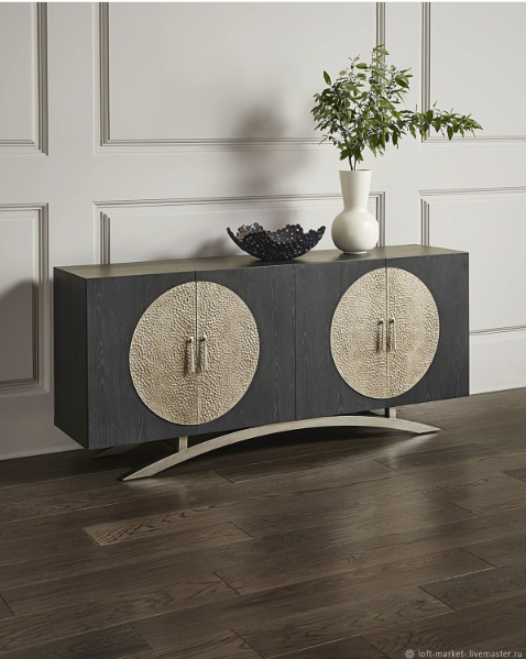 Комод Сourt изготовлена вручную из массива, твердых пород дерева, массива чёрного дерева и металла. Ручки изготовлены из металла в виде капли. На фасадах представлено необычное дизайнерское решение. Металлические круги с фактурным рисунком. Металлическое подстолье в виде арки дополняет изделие и придает ему легкость.
