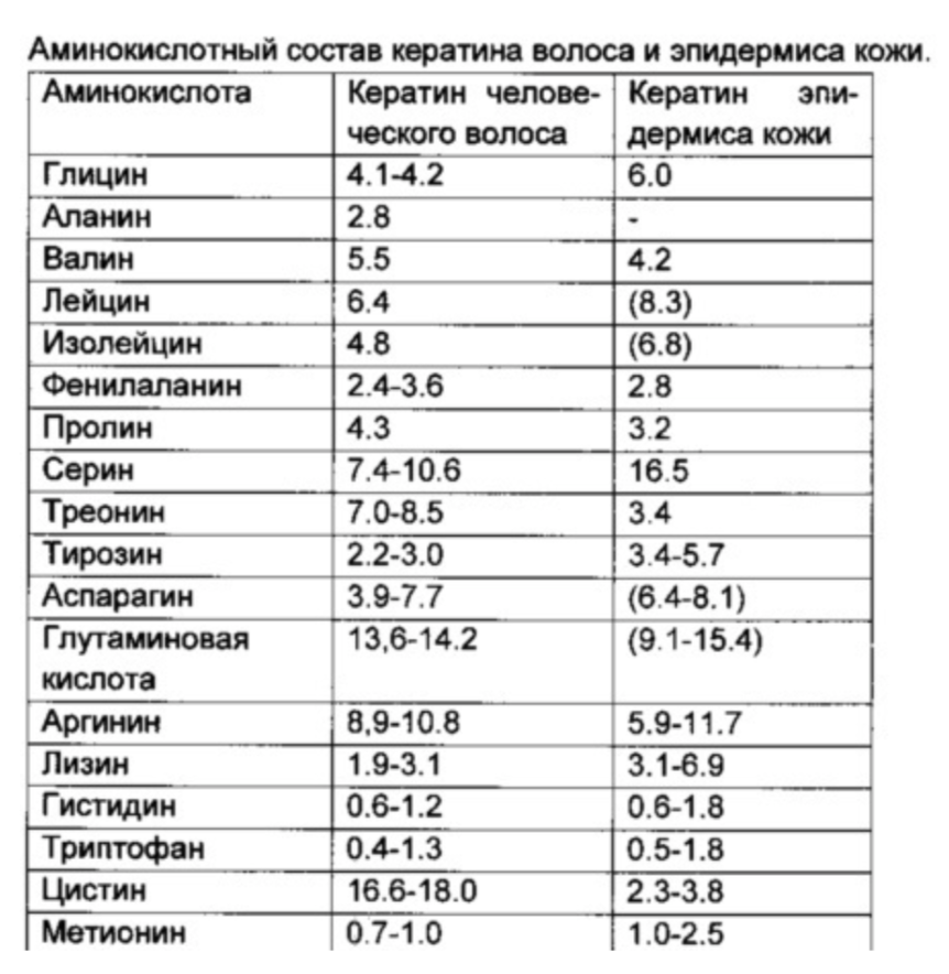 Волосяное волокно построено из кератина. Это прочный фибриллярный белок, структура которого позволяет максимально реализовать защитную функцию. Из кератина построен и эпидермис нашей кожи, но 2 этих белка хоть и относятся к одному семейству, но различаются по аминокислотному составу. Полный состав кератинов в % представлен ниже. Кератин волос в большом количестве содержит цистин. По данным различных источников, его концентрация достигает 17-21%. Это серосодержащая аминокислота, принимающая участие в стабилизации молекулы кератина за счет формирования дисульфидных мостиков. Цистин очень чувствителен к окислению: перекись водорода и щелочи, используемые парикмахерами, окисляют его до цистиновой кислоты. При этом локоны теряют свой естественный блеск, нарушается эластичность, усиливается ломкость. Витамины и микроэлементы Сера является структурным материалом для построения цепочки кератина, поэтому она крайне важна. В большом количестве сера содержится в яйцах, рыбе и бобовых. Если вы хот