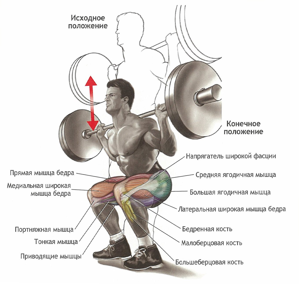 В целом совокупность фактических данных не подтверждает утверждения о том, что глубокие приседания вредны для стабильности коленного сустава. На самом деле, было показано, что усилия ACL и задней крестообразной связки (PCL) уменьшаются при больших углах сгибания колена. Усилия ACL достигают максимума между 15 и 30% сгибание, значительно уменьшающееся при 60 градусах и затем выравнивающееся при более высоких углах сгибания. Пиковые значения PCL наблюдаются примерно на уровне 90 градусов и после этого быстро снижаются. При превышении 120 градусов усилие на PCL минимально. Соответственно, вероятность повреждения связок, по-видимому, скорее уменьшается, чем увеличивается в самых глубоких частях приседания. Приседание под большим углом сгибания действительно может оказывать защитное действие на связочные структуры, явление, которое можно, по крайней мере частично, объяснить сдавлением задних мягких тканей между дистальным и проксимальным отделами бедренной кости. Это стесняет коленный сустав, тем самым ограничивая величину перемещения большеберцовой кости и, таким образом, повышая устойчивость к нагрузке. Теоретически, любой повышенный риск травмы колена при глубоком приседании приведет к повреждению менисков и суставного хряща. Пиковые силы сжатия большеберцовой кости приходятся примерно на 130% сгибания колена, что подвергает эти конструкции большему напряжению. Высокая величина пателлофеморальной нагрузки, возникающая из-за контакта нижней части коленной чашечки с сочленяющимися частями бедренной кости во время сильного сгибания, также повышают восприимчивость к пателлофеморальной дегенерации.