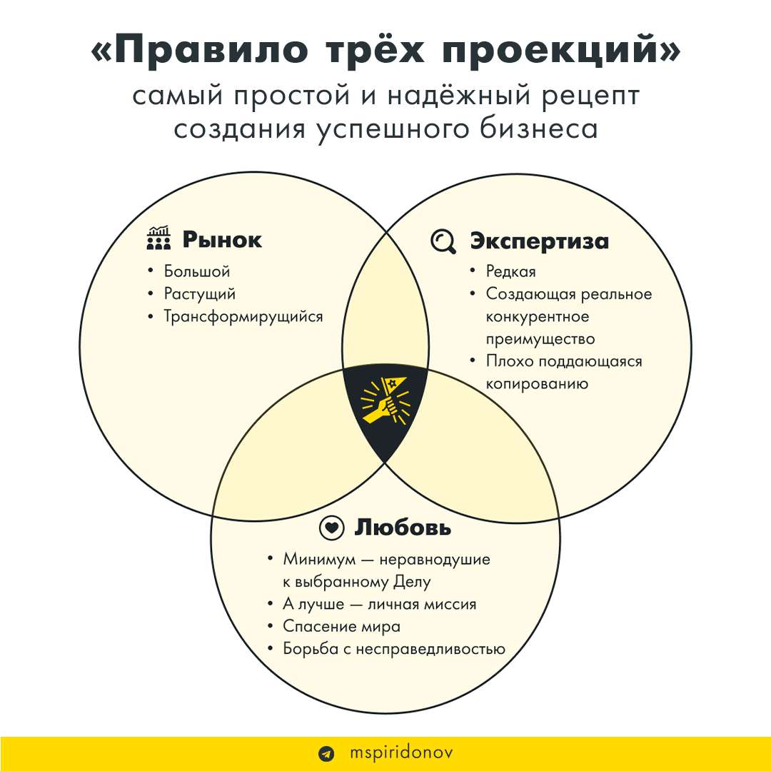 В закрытом чате клуба Reforma я регулярно отвечаю на вопросы резидентов. Подумалось, что можно делиться наиболее интересными ответами и здесь. Один из вопросов ко мне звучал так: «Хочу начать новый бизнес. Выбираю между кафе, консалтингом, туризмом и торгами по банкротству. Где ты видишь рост и масштабирование?» Мой ответ: Привет! Сперва общее соображение: разлёт направлений движения слишком большой и, по мне, небезопасный — такая «полигамия» может привести к расфокусу и топтанию на месте. Особенно если (упаси бог) попытаться запускать это одновременно. Последнее время для принятия решения по оценке нового для меня бизнеса или его перспектив я рекомендую свою концепцию, которую назвал «правилом трёх проекций». Это способ дать экспресс-оценку проекта через рассмотрение его в трёх разрезах: 1️⃣ Рынок. Он должен быть: ▪️ насколько возможно большим по объёму покупательского спроса — иначе не построить что-либо значимое; ▪️ растущим (прилив поднимает все лодки); ▪️ а в идеале — ещё и трансф
