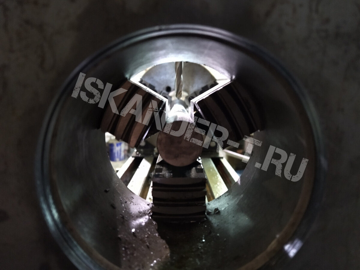 Постоянный заказчик обратился с нестандартной задачей. Сделать 20 отверстий с резьбой М10 на вале диаметром 30мм длинной 5020мм. Заказчик предоставил готовый вал, шлифованный с допуском на диаметр 0,01мм. Решили сделать сигнальный образец длинной 3м для выявления недостатков. Размеры были предоставлены со стандартным шагом группами по два отверстия. Для выполнения заказа пришлось развернуть станок, чтобы вал смещать в открытую дверь. Изготовили приспособления для двух трехкулачковых патронов диаметром 315мм. Для точного позиционирования использовались высокопрецизионные втулки. Использовался фрезерный станок 6М12П. Технологическая карта производства предполагала: - сверление втулки с валом для позиционирования вала от вращения по оси (оно же первое отверстие); - сверление в 2 этапа – центровочным сверлом и сверлом на 8,5мм (быстрорежущая сталь); - расстояние между отверстиями отмерять по УЦИ; - фаска на отверстиях зенковкой; - после сверления всех отверстий, нарезание резьбы. Быстрореж