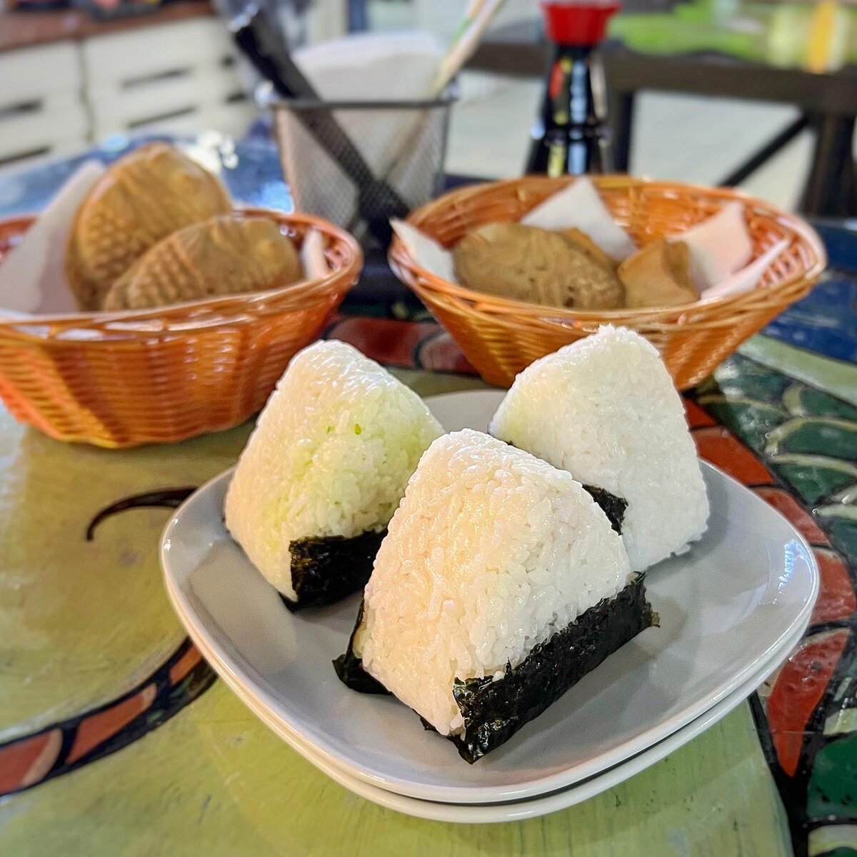 Онигири из меню японского бистро «ТАКИ ТАКИ Тайяки» по 350 ₽ за 3 штуки. Онигири — сейчас популярный вид снека. Особенно у молодёжи. По сути онигири — это пресный рис в виде треугольника или шарика с начинкой внутри и лист водорослей нори, чтобы было удобно держать в руке. Такой японский вариант бутерброда. Начинки разнообразные. Я взял с лососем и сливочным сыром Cremette, со снежным крабом (читай — крабовые палочки) и сливочным кремом и с водорослями чукка в кунжутном соусе. Рис сварен превосходно. Риса много, но много и начинки. Каждая начинка по-своему хороша, тут уж кому что больше нравится. К онигири подают соевый соус, при желании можно слегка окропить им. По мне так в этом случае вкус становится выигрышнее. Вкусно. И намного интереснее, чем онигири из супермаркета. Если съесть все три онигири, в принципе, больше ничего не нужно — гарантированно наедитесь. Про тайяки японские вафли в виде рыбок, писал подробно в прошлом обзоре этого заведения. Повторюсь, они здесь прекрасны
