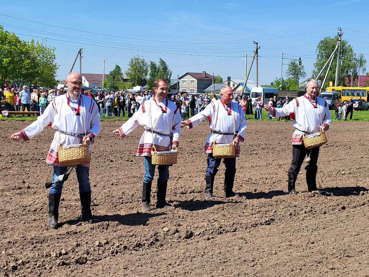 По традиции почётных гостей угостили печеньем в форме жаворонков, в одном из которых «на счастье» спрятали монетку. В роли мужчин-засевальщиков – почётные гости праздника во главе с министром сельского хозяйства и продовольствия Дмитрием Филипповым. Засевальщики переоделись в рубахи и сапоги, взяли корзины с зерном. Труд в поле по русскому обычаю благословил батюшка.