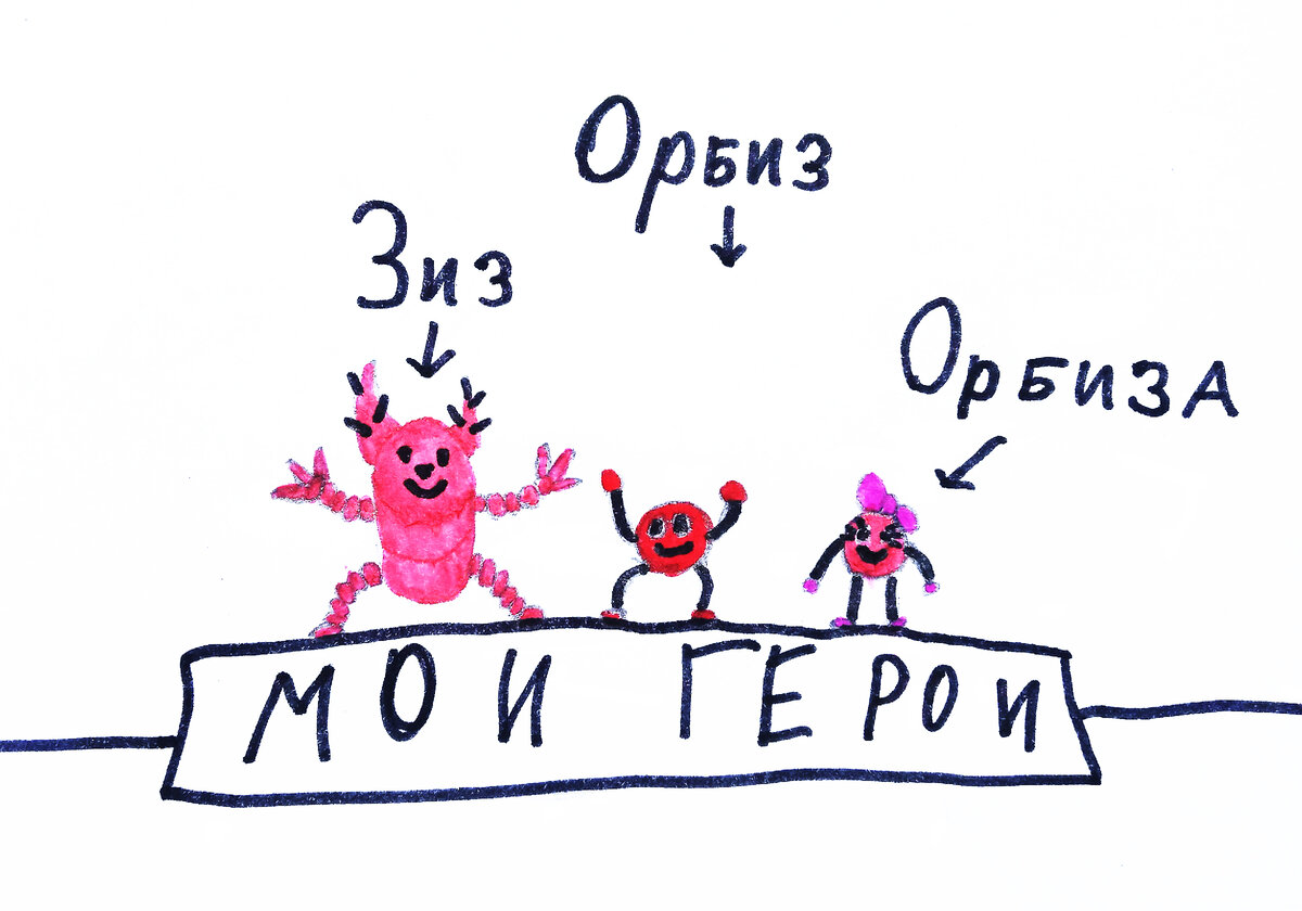 Но однажды случилось так, что играя, Орбиз случайно провалился дырку под пробкой. Шарик испугался и начал лезть наверх. Он лез, лез, лез и, наконец, вылез. И тут встретил розового покемона Зиза** – своего лучшего друга. У него были большие рога с пупырышками, длинные руки и ноги с тремя пальцами. Зиз тоже плавал и играл.