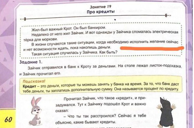 И не только смотрим, а пробуем решить. Жил был Зайчик и у него сломалась электрическая тёрка, что делать? Идти в банк к Кроту за деньгами. Какие же бывают кредиты: Зайчика жестоко обманывают, таких процентных ставок практически не существует, и не показывают кредитные ставки быстроденег. На картинке хотя бы правильно показали схему обогащения Крота. Стоимость тёрки - 2 монеты, а пользование деньгами - 5 монет. Какой же кредит выбрать? Однако тёр