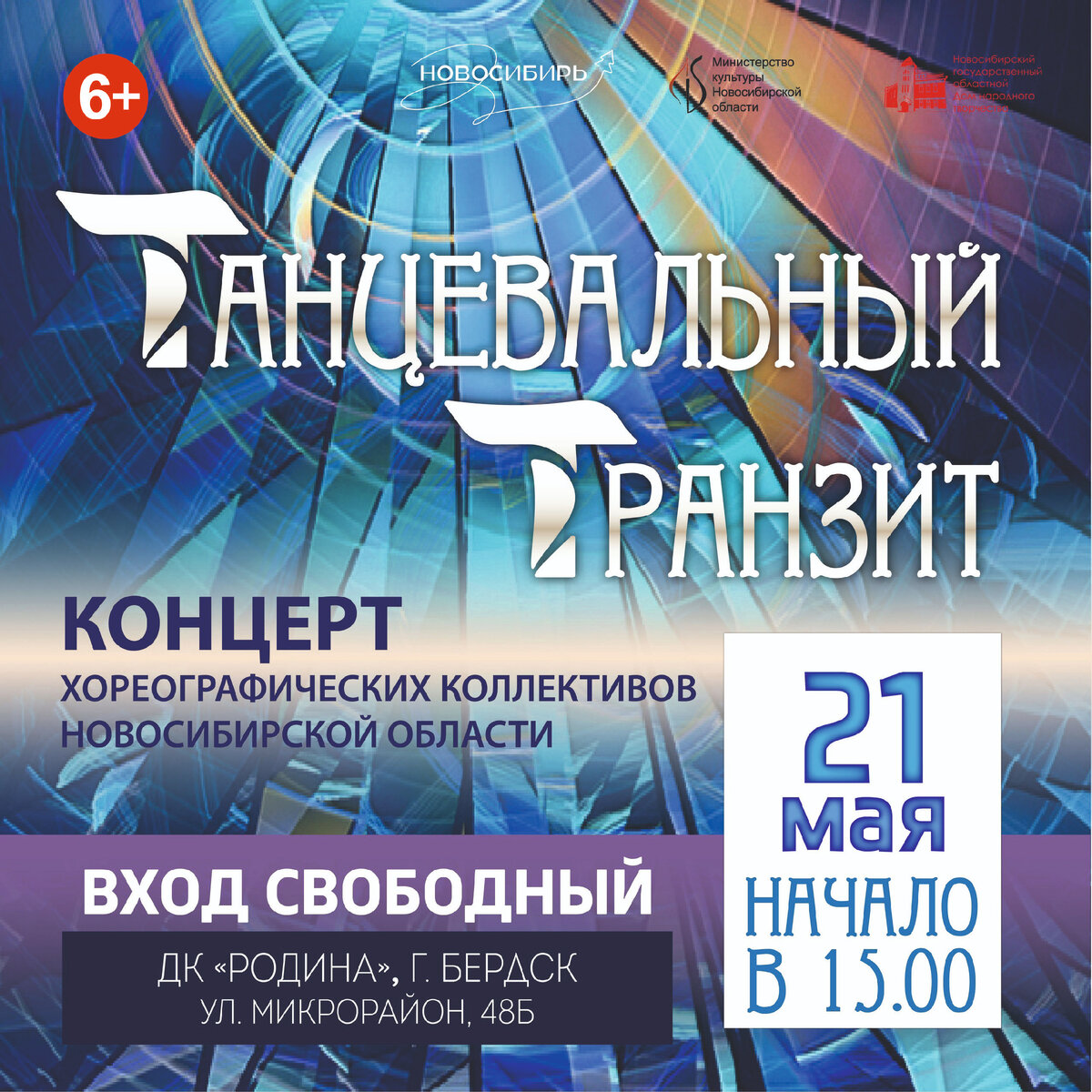 21 мая Творческий проект Новосибирского государственного областного Дома народного творчества «Танцевальный Транзит», начавшийся 24 апреля с грандиозного концерта и мастер-классов от ведущих экспертов в Новосибирске, переместился в город Бердск. Зональная встреча начнется с Мастер-класса для руководителей хореографических коллективов, который проведет руководитель Образцового коллектива хореографического ансамбля «Сувенир» Эльвира Гончарова. В 15 часов на сцене ДК «Родина» состоится концерт ведущих коллективов из Новосибирского района, города Искитима, Новосибирска, а также образцовые и народные самодеятельные коллективы хореографические ансамбли города Бердска: «Забава», «Обские зори», «Сувенир», «Экспромт», «Карусель», «Серпантин», «Талисман», «Улыбка», «Арабески» Дворца культуры «Родина», ансамбль народного танца «Бердчаночка» и ансамбль эстрадного танца «Имидж» Городской центр культуры и досуга. Ждем вас на нашем празднике танца!!! МАУ «Дворец культуры «Родина» г. Бердск, ул. Микр