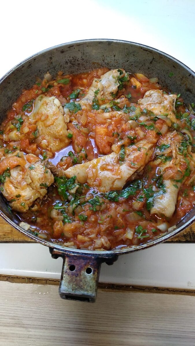 На 6 порций: 2 куриных окорочка, 2 помидора, 2 головки репчатого лука, 2 зубчика чеснока,1 ст. л. томатной пасты, растительное масло, перец, соль, уцхо-сунели. Каждый окорочок разрезать на три части, посолить, поперчить. Ошпарить помидоры, очистить от кожицы, нарезать кубиком. Также нарезать лук, измельчить чеснок. На небольшом количестве растительного масла (2-3 ст. л.) обжарить до золотистой корочки мясо. Готовое мясо убрать из сотейника. Пассеровать лук, добавить помидоры, чеснок, томатную пасту. Протушить в течение 10 минут, добавить немного соли, специи. Вернуть курицу в сотейник, тушить еще минут 10-15 на медленном огне с закрытой крышкой. Приятного аппетита! #курица #овощи #рецептнаны