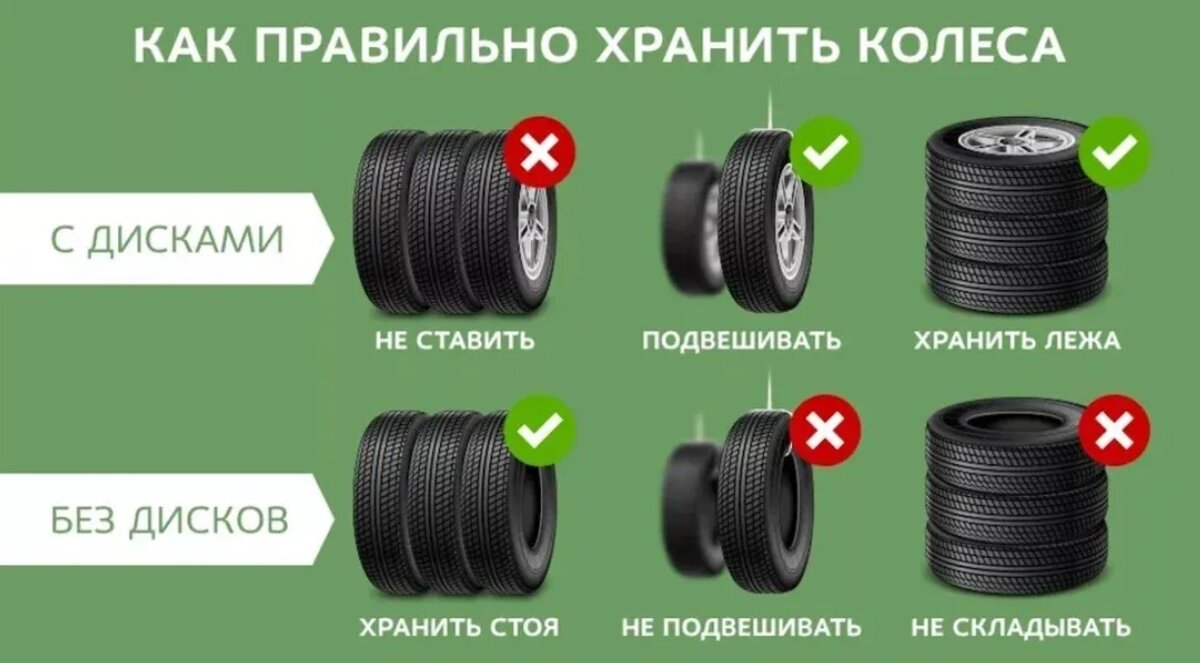 Важно хранить зимние шины в прохладном, сухом месте, вдали от солнечного света, тепла и влаги. Воздействие этих элементов может привести к ускоренному разрушению шин, что приведет к об