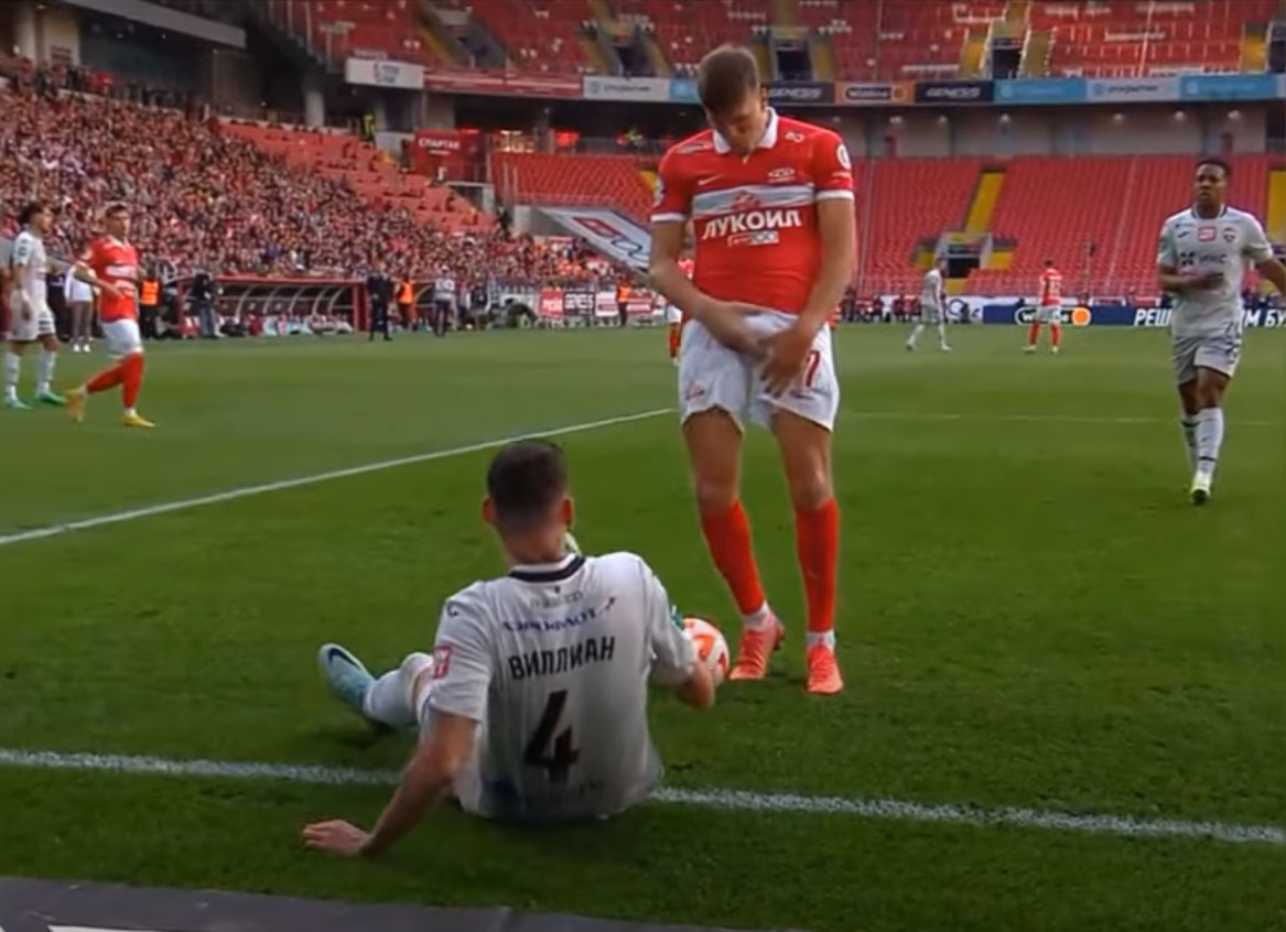 Дисциплинарный комитет РФС на заседании по итогам матча между «Спартаком» и ЦСКА (2:1) принял решение дисквалифицировать нападающего «красно-белых» Александра Соболева на четыре матча и отменить удаление защитника армейцев Виллиана Роши. Жест гопника Скандальная ситуация произошла на 65-й минуте матча при счете 1:1. Соболев и Виллиан Роша боролись в штрафной ЦСКА. Нападающий «красно-белых» завалил защитника, но, посчитав его падение симуляцией, принялся жестикулировать в районе паха, намекая на то, что соперник был не прав. Манипуляции Соболева крупным планом были сняты телевизионной камерой.