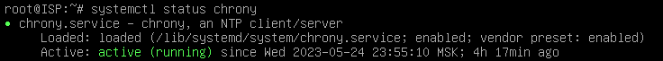 Машина ISP Проверим работает ли хрони командой systemctl status chrony Далее перейдём в конфигурационный файл. nano /etc/chrony/chrony.conf Нам необходимо его отредактировать до такого вида. Перезапускаем сервис. systemctl restart chrony И проверяем его статус. systemctl status chrony Проверим дату и время. date timedatectl set-timezone Europe/Moscow Проверка синхронизации Chrony в Linux chronyc tracking chronyc clients Теперь настроим время на CLI. После применения настроек на ISP высветится клиент. Преходим