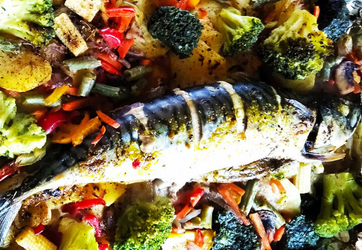 У скумбрии убираем внутренности и жабры, моем, делаем поперечные надрезы. Натираем приправой для рыбы. Готовим (моем-чистим-нарезаем) овощи. Дно противня выстилаем фольгой, смазываем растительным маслом. Выкладываем лук, овощи, солим, перчим, посыпаем приправами для овощей. Сверху выкладываем скумбрию, накрываем фольгой. Запекаем при 190градусах 20 минут. Потом убираем фольгу, и ещё 10 минут запекаем до готовности. Больше общения и рецептов - в группе "Рецепты для диабетиков" в ВКонтакте! Рецепт на странице Автор рецепта – Людмила Гурова