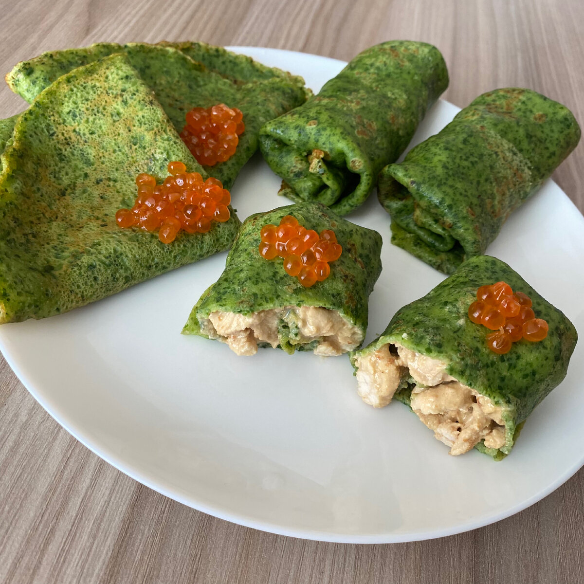 - По желанию можно добавить начинку (у меня это тушеное куриное Филе с сыром и сметаной и красная икра )