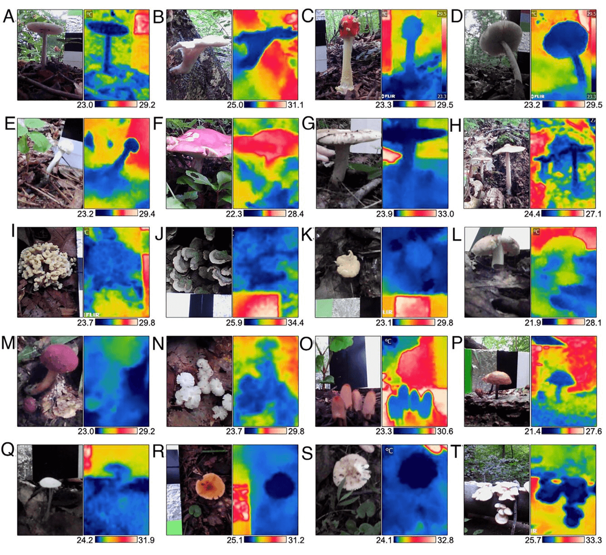 В первые дни пандемии коронавируса американский микробиолог Радамес Кордео решил испытать новую тепловизионную камеру в находящемся рядом лесу. Изначальная цель работы заключалась в поиске у некоторых грибов темных пигментных пятен, влияющих на температуру их поверхности. Во время своих походов Кордеро заснял около 20 видов грибов, и все они, вне зависимости от вида и расцветки, оказались холоднее окружающей среды. Продолжив исследования в лаборатории, исследователи обнаружили, что часть видов, таких как Amanita brunnescens, были всего на 1—2 °C холоднее окружающей среды. Рекордсменом исследования стали грибы Pleurotus ostreatus — они почти на 5,9 °C холоднее. Ко всему прочему, 19 видов плесени и дрожжей также были относительно холодные, особенно вблизи центра колоний. Даже при экстремально низкой температуре воздуха (близкой к замерзанию) в колониях было в среднем на 1 °C холоднее. Такой эффект обусловлен испарением воды, выяснили ученые. Сложная архитектура нижней стороны шляпок гриб