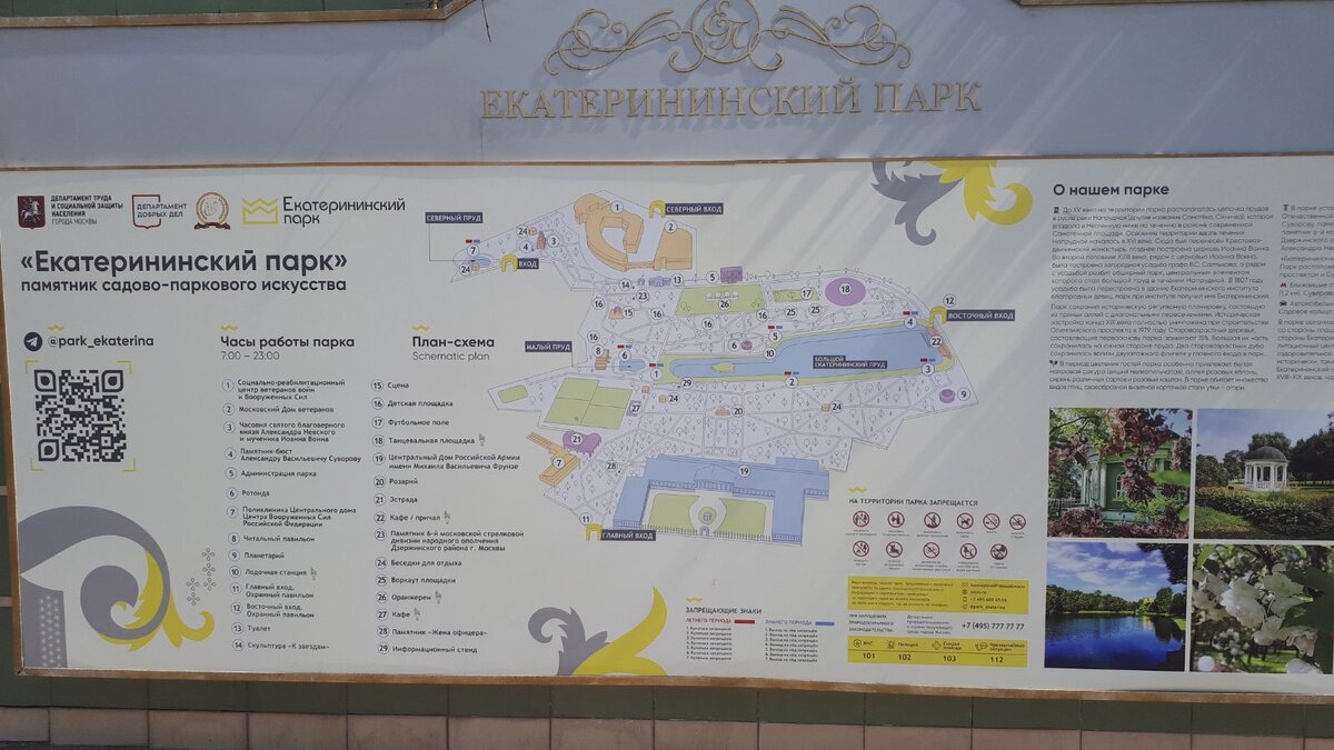 Екатерининский парк находится рядом с театром Российской Армии, а с территории можно увидеть открытую экспозицию техники музея Вооруженных сил. В самом парке есть памятник Великой Отечественной войне