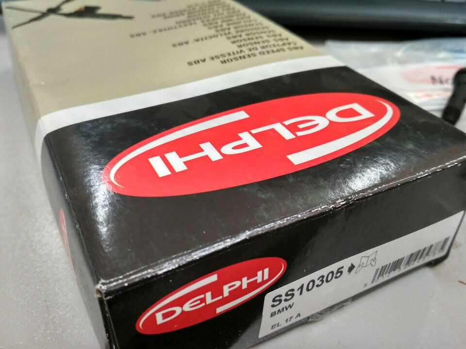 Напомню, что предыдущая замена датчика привела к нехорошим последствиям. Датчик FAE постоянно ловил ошибки, всячески бесил машину и если какое-то время она еще ездила с ним нормально, то после начинала сходить с ума. Заводишь машину — горит ошибка. Едешь немного ошибка исчезает. Жмешь тормоз — машина думает что на гололеде и ABS постоянно отдает в тапок. Разгон до 40 и ABS вываливается в ошибку. Ездил так с месяц два, устал да и ABS жалко. Так ездить нельзя, нужно решать. Думал что брать. Оригинал супер дорого и без возможности нормально вернуть в случае обрыва провода. Hans Pries лично проверенный вариант более чем устраивает, но все-же осознание, что это явный Китай, не давало мне покоя. Да хансприс работает отлично, но хорошо помню что из трех датчиков АБС HansPries я выбрал только один у которого с сопротивлением было все в норме. Писали мне что Delphi отлично работают, пусть будет Delphi! Delphi SS10305 — Датчик ABS передний BMW e39 Отлично упакован, получше всяких других. Грустна