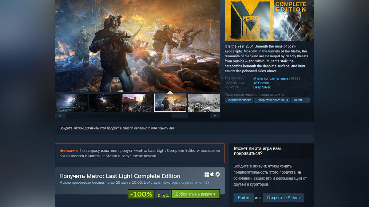 Студия 4A Games, как и обещала, запустила в Steam бесплатную раздачу полной версии шутера Metro: Луч Надежды. Вы можете получить его из своей библиотеки до 25 мая.