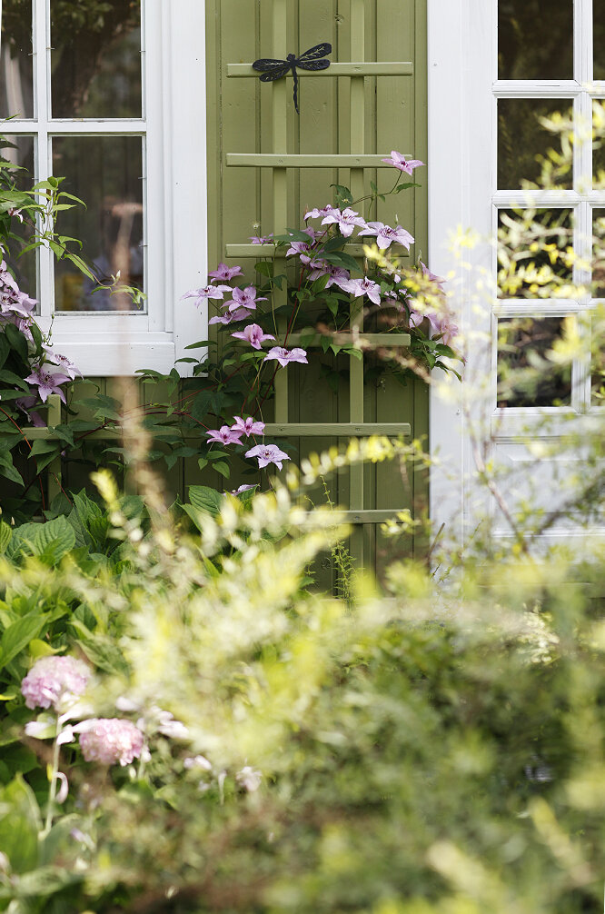 Меня уже несколько раз спросили, как устроена решетка на домике, как закреплена. Я пофоткала немного, тут три решетки около каждого окна - две по бокам, и одна внизу. На фото нижняя, под окном. Тут сразу видно и как она крепится, и как сделана. Для крепления взяты бруски и прикручены вместе с решеткой к домику длинными шурупами. Решетку делал муж, я так ровно не умею. Все покрашено, как и домик, краской Тиккурила Винха, цвет Суветар. Это краска-антисептик, очень укрывистая, быстросохнущая и прочная. Домик покрасили в 2017 году, причем лето было очень мокрым. Но вид и сейчас - как новый. Это южная сторона, хотя и притенена деревьями. О том, как сделан домик, можно прочитать у меня на канале. А вот муж, добрый человек, сфотографировал с линейкой - отличная идея! Сразу видны все размеры. Надеюсь, вопросов не останется. Ну как, понятно? Надеюсь, да! Кстати, все обещаю показать, что внутри домика, но никак не соберусь. А вот на этом фото можно разглядеть два диванчика с подушками, которые