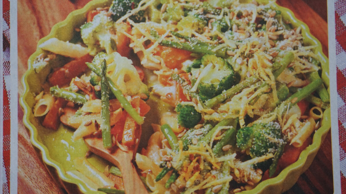 Этот рецепт предложил итальянец Илья Добров. Если бы предложил я то блюдо называлось бы - макароны с овощами. Для начала вы посмотрите как оно красиво смотрится. Возьмите пасту (перья) (макароны) -200 гр. Сыр - пармезан -25 гр. Твёрдый сыр - 50 гр. Морковь - 2 шт. Спаржа - 100 гр. Брокколи - 200 гр. Жаренные семечки - 15 гр. Панировочные сухари - 50 гр. Мука - 1 ст. л. Молоко - 1 стакан. Оливковое масло - 1 ст.л. Сливочное масло - 1 ч.л. Соль и молотый перец - по вкусу. Способ приготовления: 1- Пасту (макароны) отварить согласно инструкции на упаковке. Откинуть её на дуршлаг, затем переложить её в смазанную сливочным маслом форму. 2- Брокколи и разобрать на соцветия. Морковь очистить и нарезать брусочками. Отварить овощи до полуготовности. 3- Спаржу варить 7-10 мин. Смешать в форме с пастой. 4- Для соуса молоко с мукой протереть до загустения. Вмешать тёртый твёрдый сыр. 5- Полить соусом пасту( макароны) с овощами и слегка перемешать. 6- Смешать сухари, тёртый пармезан,