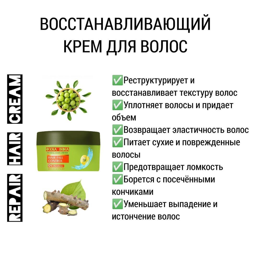 Травяной крем для волос для восстановления структуры волос. Особенно рекомендую при сухих волосах. В составе Бринградж, Амалаки и Лакрица, благодаря которым крем восстанавливает и питает поврежденные волосы и корни, проникая глубоко в структуру волоса. Сохраняет волосы сильными и здоровыми в течение всего дня. Омолаживает волосы, кожу головы и корни. Формула крема идеально подходит для частого использования, чтобы поддерживать волосы здоровыми, блестящими и красивыми в течение всего дня. Действие крема: 🌿 Уменьшает выпадение волос и их истончение.