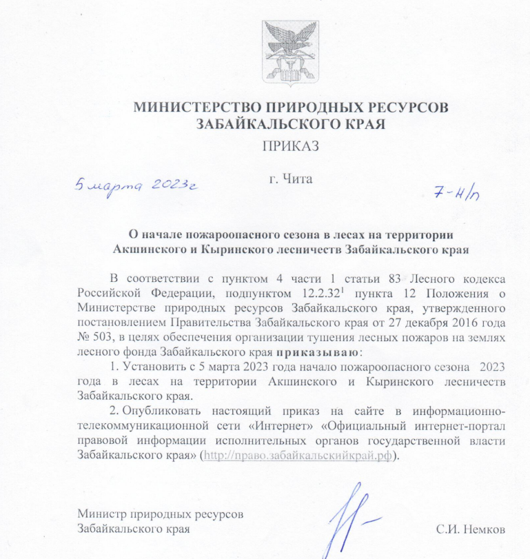 Министерство природных ресурсов Забайкальского края объявило о начале пожароопасного сезона на территории Акшинского и Кыринского лесничеств